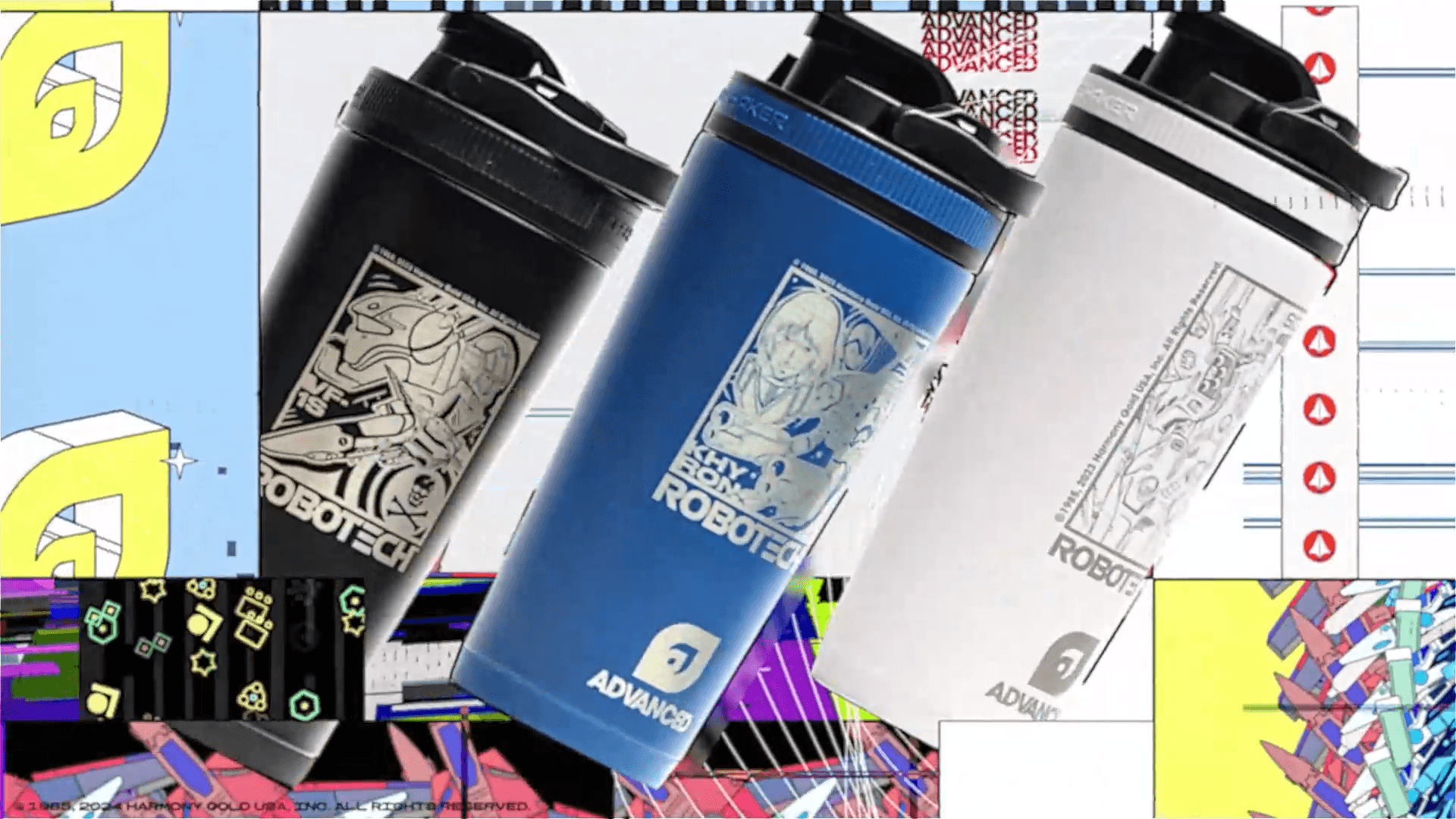 Edwards’ portraits of Minmay and the Veritech fighters were stylized with Xerox-era roughness, and my job was to engineer how those illustrations collided with ADVANCED’s product visuals. I built a kinetic system of spins, bursts, and impact frames that let shakers and capsules whip across screen without overwhelming the artwork. The result is a playful mashup where timeless illustration and modern merch feel like they share the same physics.